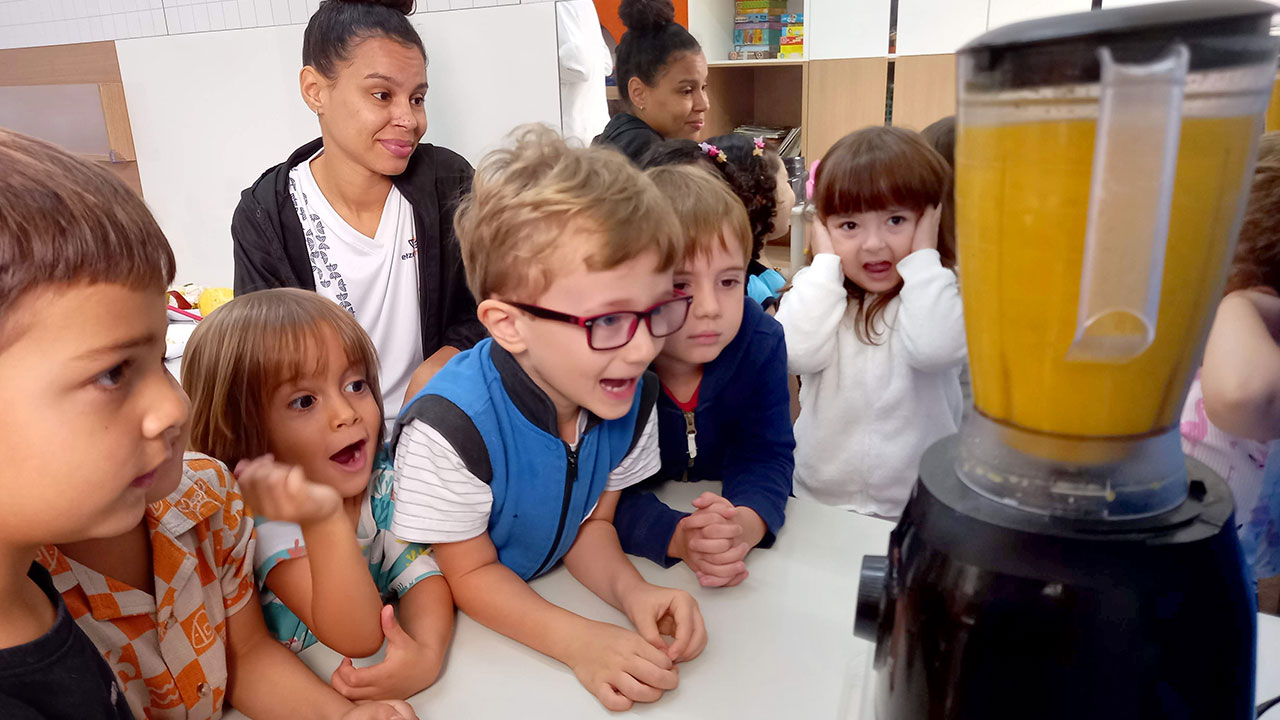 A nutricionista da escola divulga mensalmente os cardápios, feitos com o objetivo de oferecer às crianças uma alimentação saudável e variada. Ela também toma cuidado especial com o cardápio dos alunos que têm restrições alimentares. Todos os dias, a equipe de nutrição acompanha as refeições das turmas.