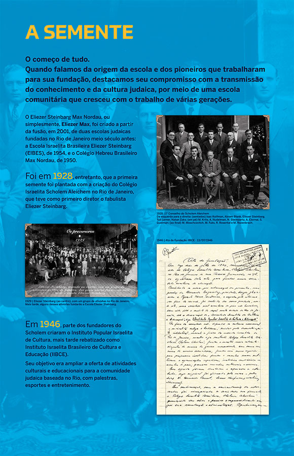 Após um período de atividades, os integrantes do IIBCE sentiram a necessidade de criar uma escola judaica moderna, humanista, não ortodoxa, progressista e comprometida com inovação pedagógica, fundando, assim, a Escola Israelita Brasileira Eliezer Steinbarg. O nome da escola foi dado em homenagem ao pedagogo, escritor e professor de ídiche e hebraico, Eliezer Steinbarg (1880-1932), nascido na Bessarábia, hoje Moldávia. Steinbarg morou no Brasil e foi uma importante figura nos primeiros anos de funcionamento do Colégio Scholem Aleichem, escola fundada em 1928, no Rio de Janeiro, pelos pais dos fundadores do instituto.